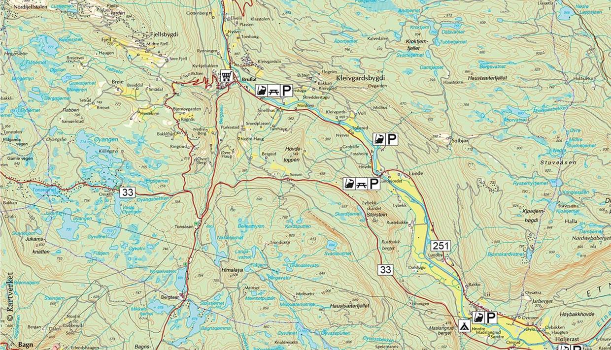 Fra Fagernes, følg E16 til Bjørgo. Ta så Fv33 mot Gjøvik/Lillehammer. Følg så skilting mot Bruflat. Fv251, som man møter i Bruflat, følger store deler av Etna.
