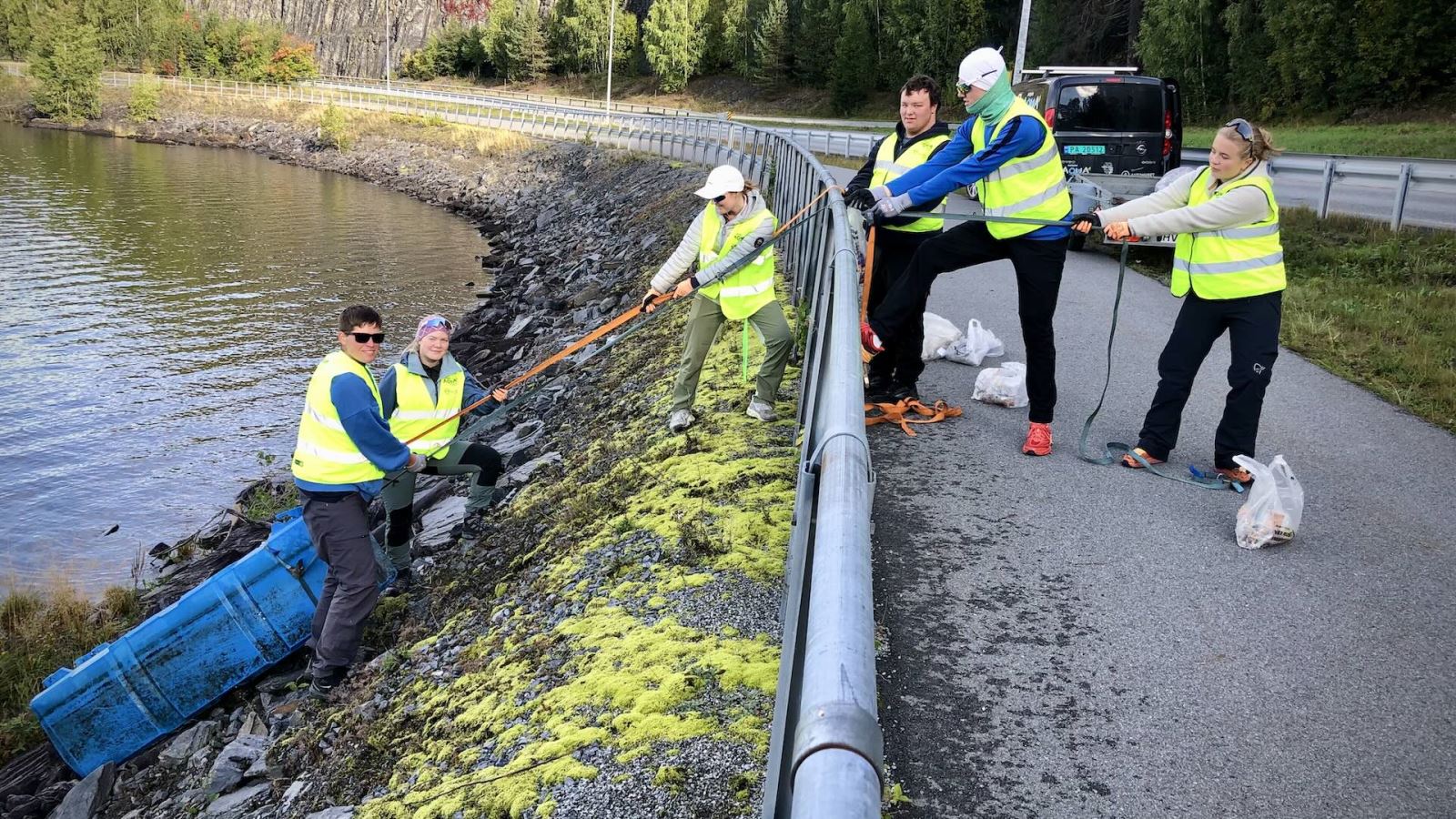 Vårens vakreste syn for oss som jobber for å minske plastfprsøpling i vassdraga våre. Her jobber en gjeng fra folkehøyskolen med å fjerne et flyteelement på avveie opp fra Strandefjorden. (Foto: Torkjell Haugen)